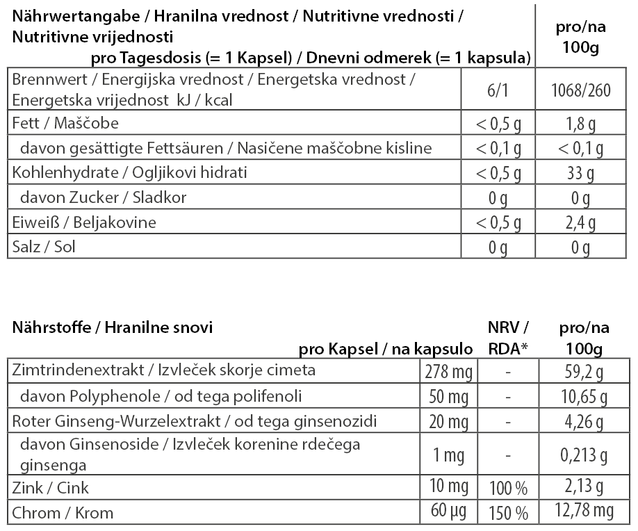 Izvleček cimeta, sredstvo za povečanje prostornine (celuloza), hidroksipropilmetil celuloza (ovojnica kapsule), izvleček korenine rdečega ginsenga, red ginseng root extract, cinkov oksid, kromov (III) klorid.
